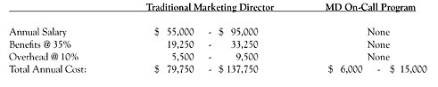Compared to full-time in-house positions, the lower costs associated with the Marketing Director On-Call program enable a company to free up funds for implementation of specified marketing goals. Below is a comparison of a full-time position versus the Marketing Director On-Call program based on an average need of 4 - 10 hours per month: